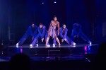 Grand Entrance: Jackson prefaced her one hour and 45-minute set with a video compilation of pivotal moments in her life and 50-year career, from growing up as the youngest sister of the famed Jackson 5 brothers to becoming a solo star in her own right. Then several beats after the video ended, followed by flashing colored lights, Jackson walked onto a circular platform in the center of the stage to extended thunderous applause and shout-outs, resplendent in a floor-length, purple-hooded cape tied with a bow at the neck, purple lipstick and a waist-long, top-knotted ponytail. Dropping the cape, she launched into “Love Me” and then “Damita Jo” wearing a gold sparkly jumpsuit and matching boots. As most fans know, the latter song is her middle name and the title of her 2004 album. It’s also one of several songs — including “Enjoy,” “Like You Don’t Love Me” and “Do It 2 Me” — that she’s been performing live for the first time. But no matter how much of the concert has already been covered in reviews thus far, nothing matches being there to experience first-hand the excitement that comes with the start of a Jackson concert.